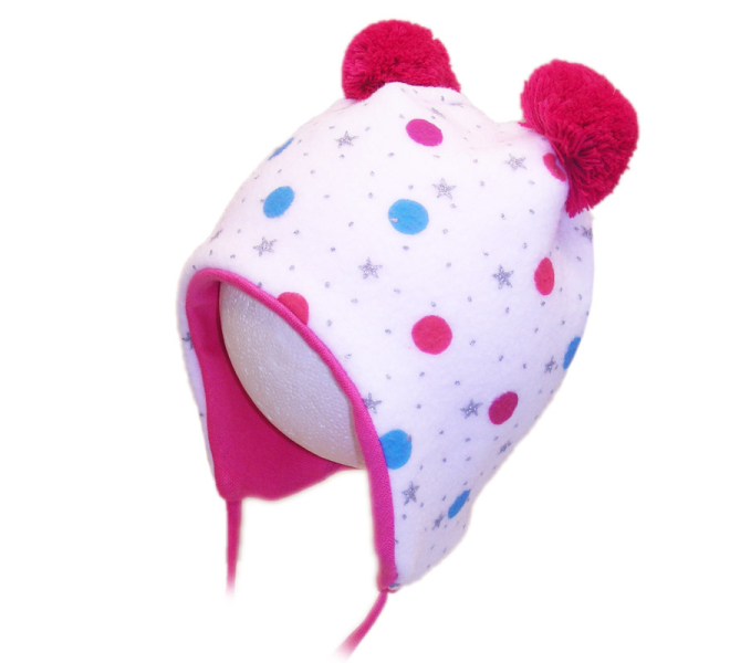 Dětská čepice zimní se šňůrkami na prodloužených ouškách a dvěma bambulkami. Kvalitní polar a podšívka z bavlny. Zadní část podšívky je řešená jako bezešvá (švy na bocích).