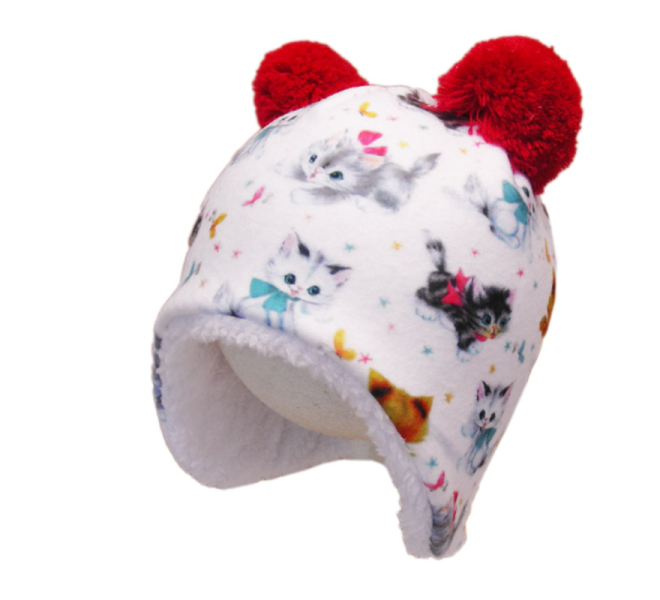 Dětská čepice zimní bez šňůrek. Zdobená potiskem koťátek a dvěma bambulkami. Kvalitní polar se sítotiskem metodou sublimace a podšívka z teplé příjemné kožešinky Luna. Zadní šev je proveden dekovačkou ( naprosto plochý šev). Nezpůsobuje tak otlaky ležícím dětem.