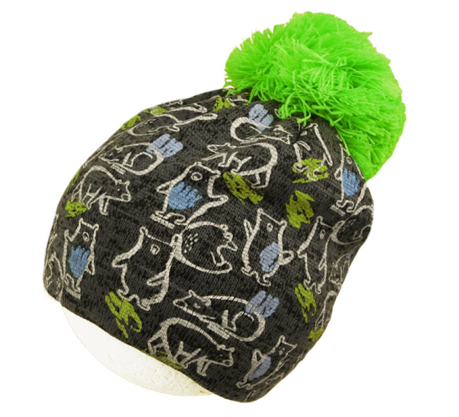 Chlapčenská čiapka z potlačenej jemnej svetroviny. Tento model je zdobený brmbolcom a je bez šnúrok.