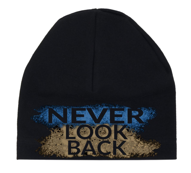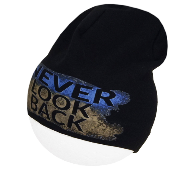 Prechodová čiapka v detských aj dospelých veľkostiach z bavlneného jednovrstvového úpletu. Cez čelo a uši, od spodnej hrany čiapky do výšky asi 3 cm, sú vrstvy dve. Veľmi dobrá pružnosť. DTF potlač Never Look Back je tiež pružná, takže pri natiahnutí nepraská.