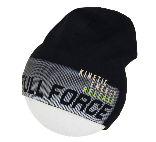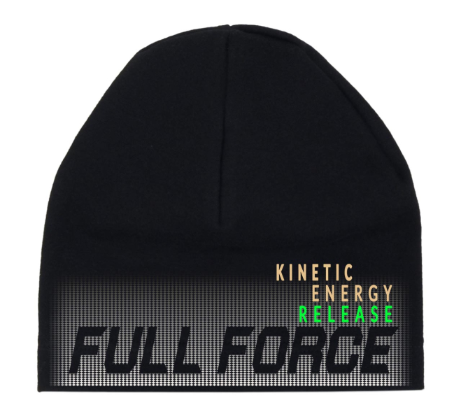 Prechodová čiapka v detských aj dospelých veľkostiach z bavlneného jednovrstvového úpletu. Cez čelo a uši, od spodnej hrany čiapky do výšky asi 3 cm, sú vrstvy dve. Veľmi dobrá pružnosť. DTF potlač Full Force je tiež pružná, takže pri natiahnutí nepraská.