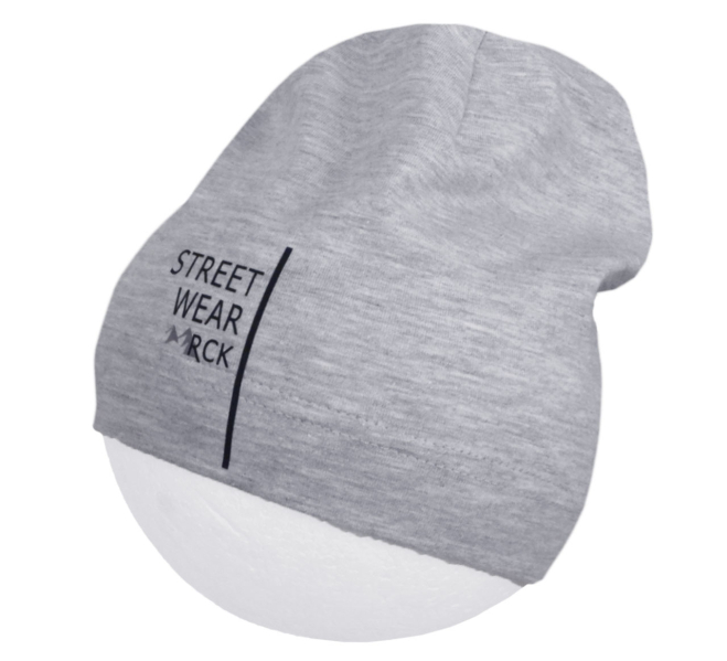 Prechodová čiapka v detských aj dospelých veľkostiach z bavlneného jednovrstvového úpletu. Cez čelo a uši, od spodnej hrany čiapky do výšky asi 3 cm, sú vrstvy dve. Veľmi dobrá pružnosť. DTF potlač Street Wear RCK je tiež pružná, takže pri natiahnutí nepraská.