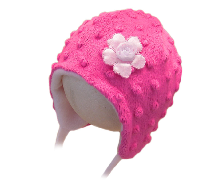 Detská čiapka zimná so šnúrkami a aplikáciou kvetinky. Kvalitný a veľmi jemný vrchný materiál Coral s bublinkami, podšitý polarom. Zadná časť podšívky je riešená ako bezošvá (švy na bokoch).