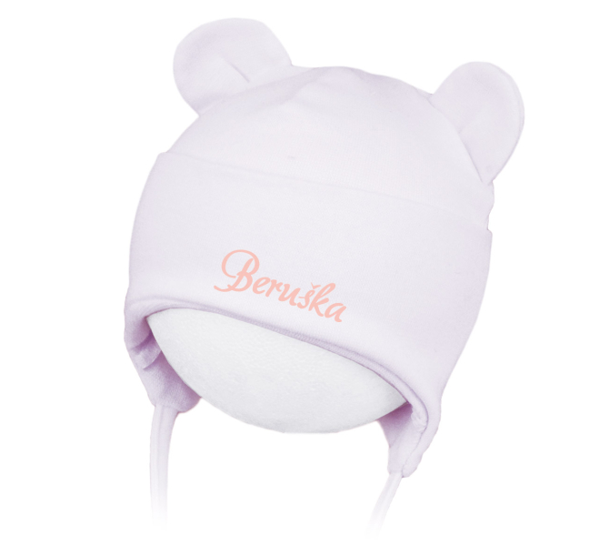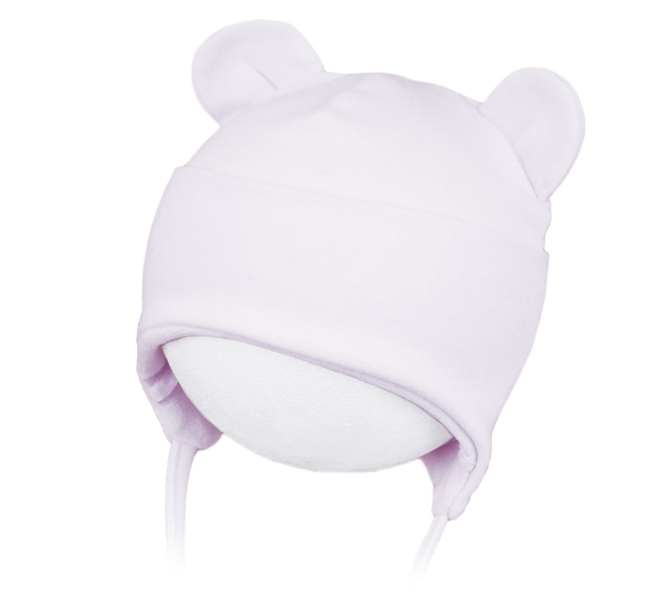 Detská čiapka Rockino so šnúrkami. Použitým materiálom je kvalitný bavlnený úplet. Model je jednovrstvový a patent cez čelo a uši je dvojito vyhrnutý. V týchto miestach teda zahrejú tri vrstvy bavlny. Zadný šev nie je jeden, ale sú dva posunuté do bokov (pozri zadný pohľad). Ležiacim deťom tak čiapočka nespôsobuje otlaky.
