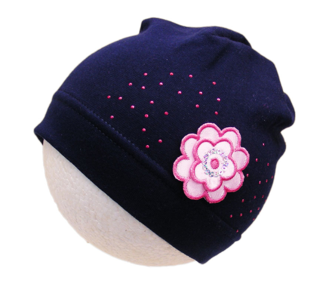Dievčenská čiapka z pružného úpletu s kvalitnou kombinovanou aplikáciou. Vyšívaný kvet a kamienky. Materiál: 96% bavlna, 4% lycra
