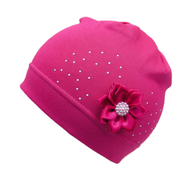 Dievčenská čiapka z pružného úpletu s kvalitnou kombinovanou aplikáciou. Vyšívaný kvet a kamienky.