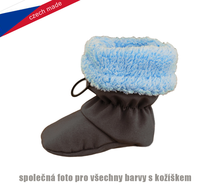 Pohodlné dvojvrstvové topánočky do kočíka. Vhodné od jesene do jari ako veľmi dobré zateplenie studených nožičiek. Vrchná vrstva Softshel v priedušnej verzii 5000/5000, vnútorná vrstva príjemný polar-fleece, vrchný diel podšívky príjemná kožušinka Luna. Ideálne ako prvé topánočky pre bábätká od narodenia až do veku cca 15 mesiacov.
