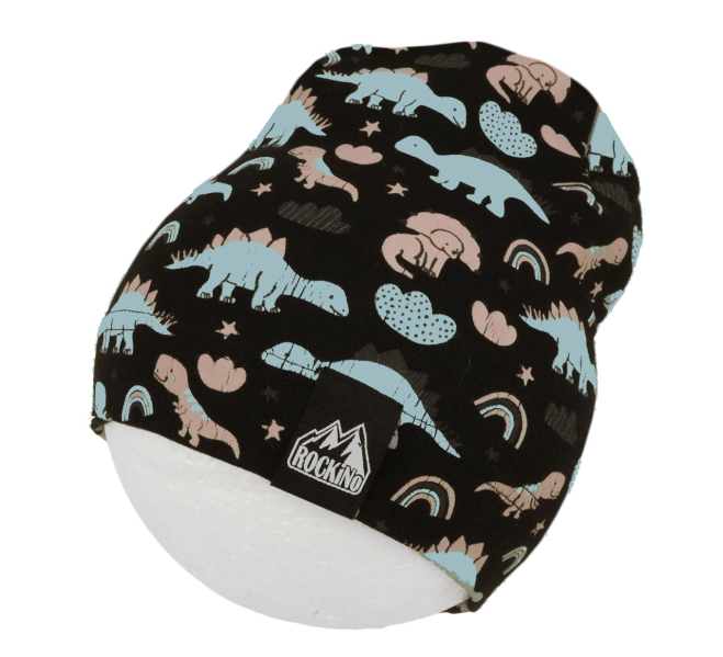 Dětská jednovrstvá čepice z pružného úpletu s potiskem. Nášivka české značky ROCKINO.