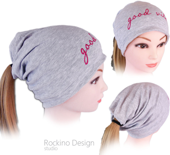 Novinkou je v poslední době oblíbený model z pružného bavlněného úpletu, který je ušitý jako tunel přehrnutý dospod. Tam je všitý do spodního lemu. Vznikne tak čepice s pohodlným otvorem pro culík a ještě k tomu dvojvrstvá. Celý střih vypadá velmi luxusně a je opatřen vyšitým nápisem "good vibes".