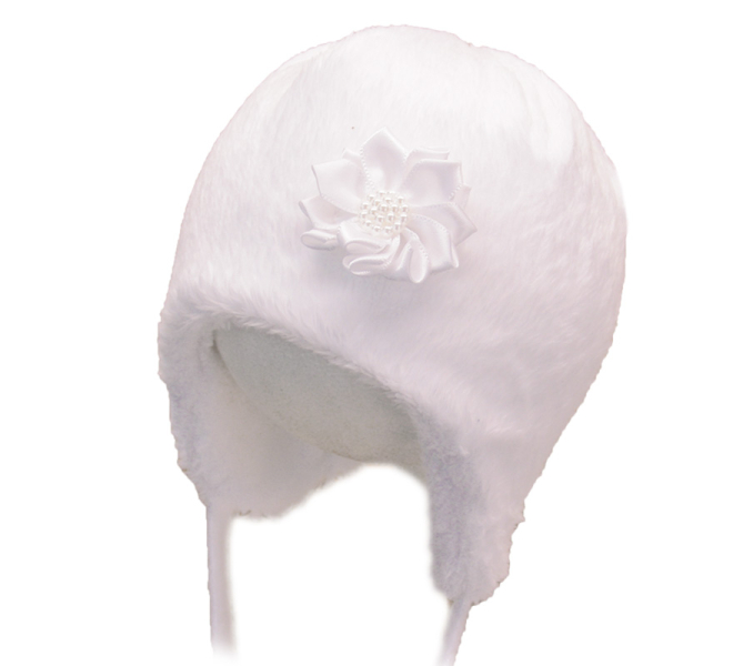 Dětská čepice zimní se šňůrkami na prodloužených ouškách. Zdobena skládaným květem, v jehož středu jsou perličky. Vrchní díl z kožešinky Coral, podšívka z teplé příjemné kožešinky Luna. Zadní část sešita plochým švem - strojem zvaným "dekovačka". Čepička tak nezpůsobuje otlaky ležícím dětem.