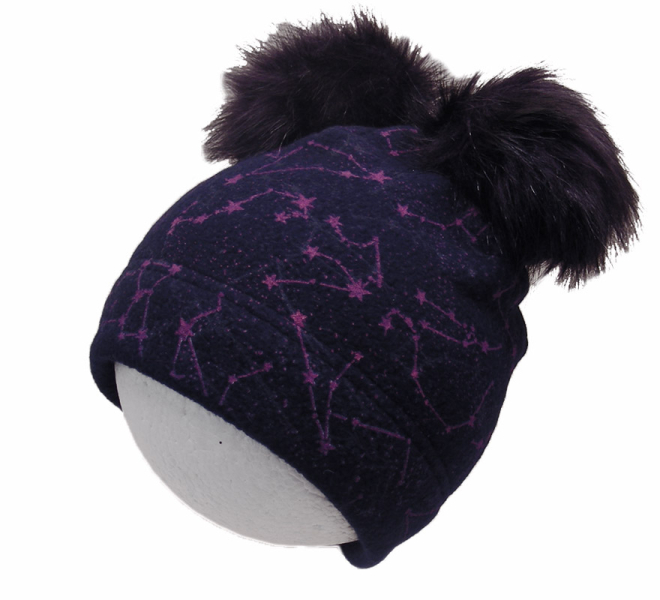 Dívčí zimní čepice ROCKINO z potištěného polaru. Zdobená dvěma bambulemi s dlouhým vlasem.