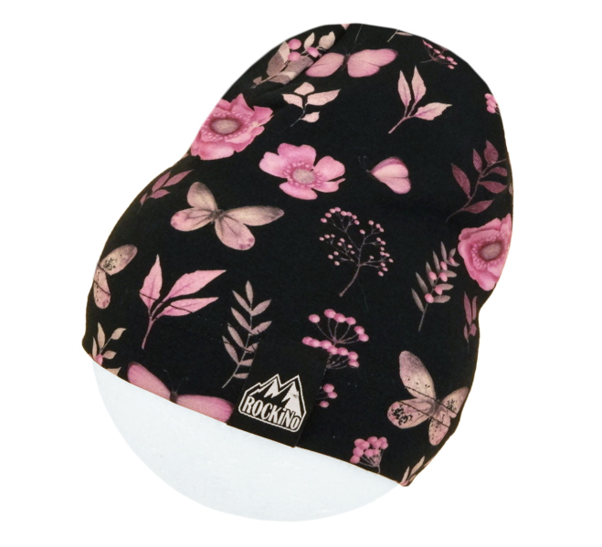 Dětská jednovrstvá čepice z pružného úpletu s potiskem. Nášivka české značky ROCKINO.