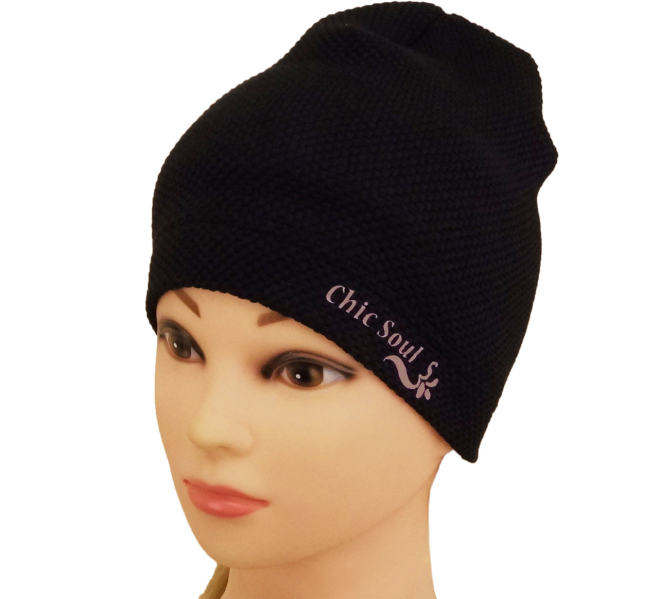 Přechodová čepice z bavlněného vroubkovaného úpletu. Přes čelo a uši, od spodní hrany čepice do výšky asi 3 cm, jsou vrstvy dvě. Velmi dobrá pružnost a perfektní vzhled. U tohoto vzoru je nápis v béžovém odstínu.
