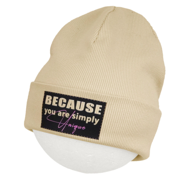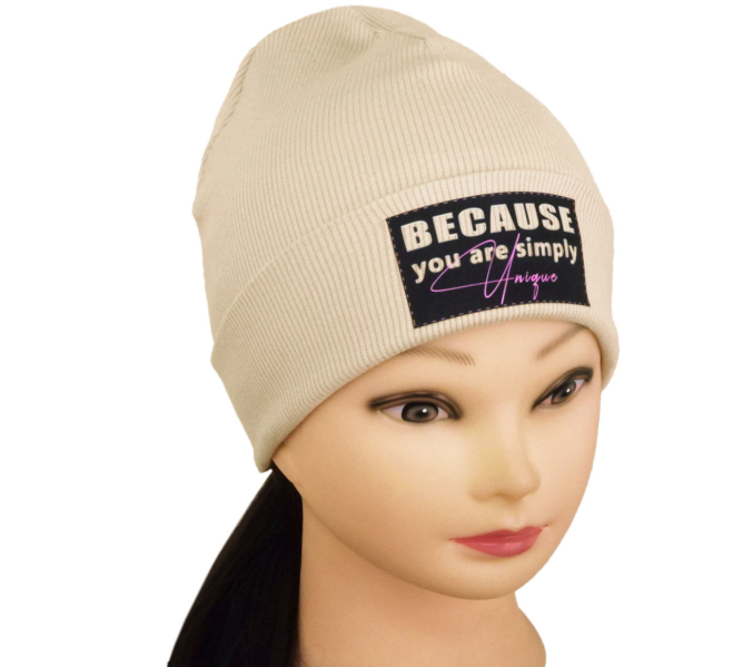 Dívčí čepice. Použitým materiálem je kvalitní bavlněný rips (žebrovaný úplet). Model je celý dvouvrstvý, je tedy velmi vhodný pro podzim i mírnější zimu. Patent přes čelo a uši je ohrnutý. V těchto místech zahřejí až čtyři vrstvy tohoto velmi dobře pružného a příjemného bavlněného materiálu. Trvanlivý a pružný DTF potisk.
