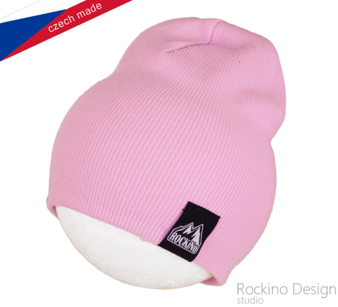 Dívčí čepice. Použitým materiálem je kvalitní bavlněný rips (žebrovaný úplet). Model je celý dvouvrstvý, je tedy velmi vhodný pro podzim i mírnější zimu. Nášivka české značky Rockino.